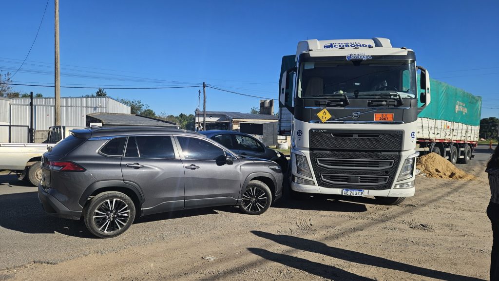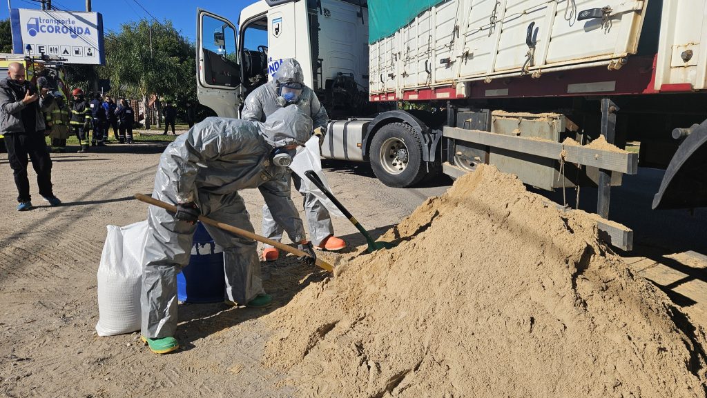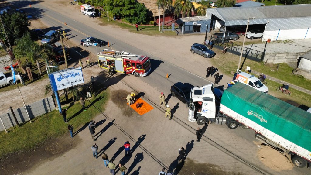 Esto surgió a través de unas reuniones y el pedido de capacitaciones de parte del Transporte Coronda. Iniciamos con el simulacro de un choque de un camión que transportaba material peligroso de clase 5 y que pretendía ingresar a la playa de estacionamiento. Allí fue embestido por una camioneta y se sumó al siniestro otro vehículo que los chocó.